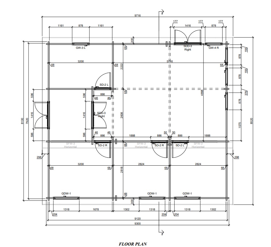 | Aknad: puitpakett 4-16-4 mm. 3 x 1306×1318 mm. avatav 1 x 752×878 mm. avatav 4 x 1967×878 mm. avatav 3 x 1956×571 mm. mitteavatav |