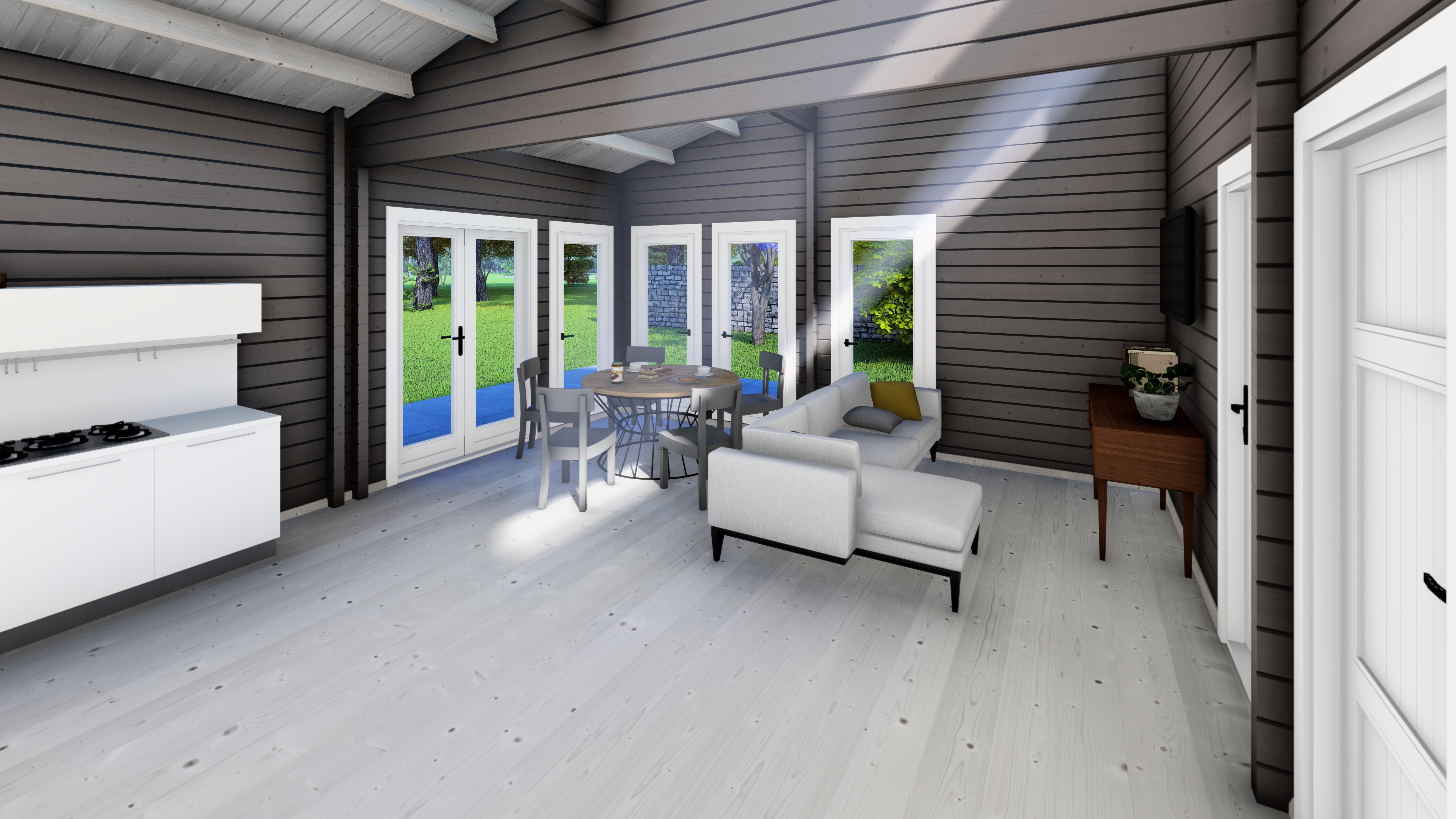 - Immutatud alusraam, põrandalaagid ja terrassi laudis (kui terrass kuulub komplekti)